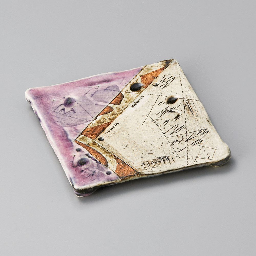 黒窯変掛け分け4.8正角皿(ピンク)(信楽焼)