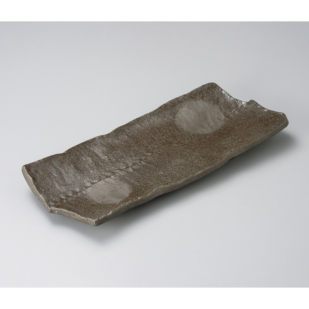 ビードロ灰釉渕錆タタラ型長角大皿