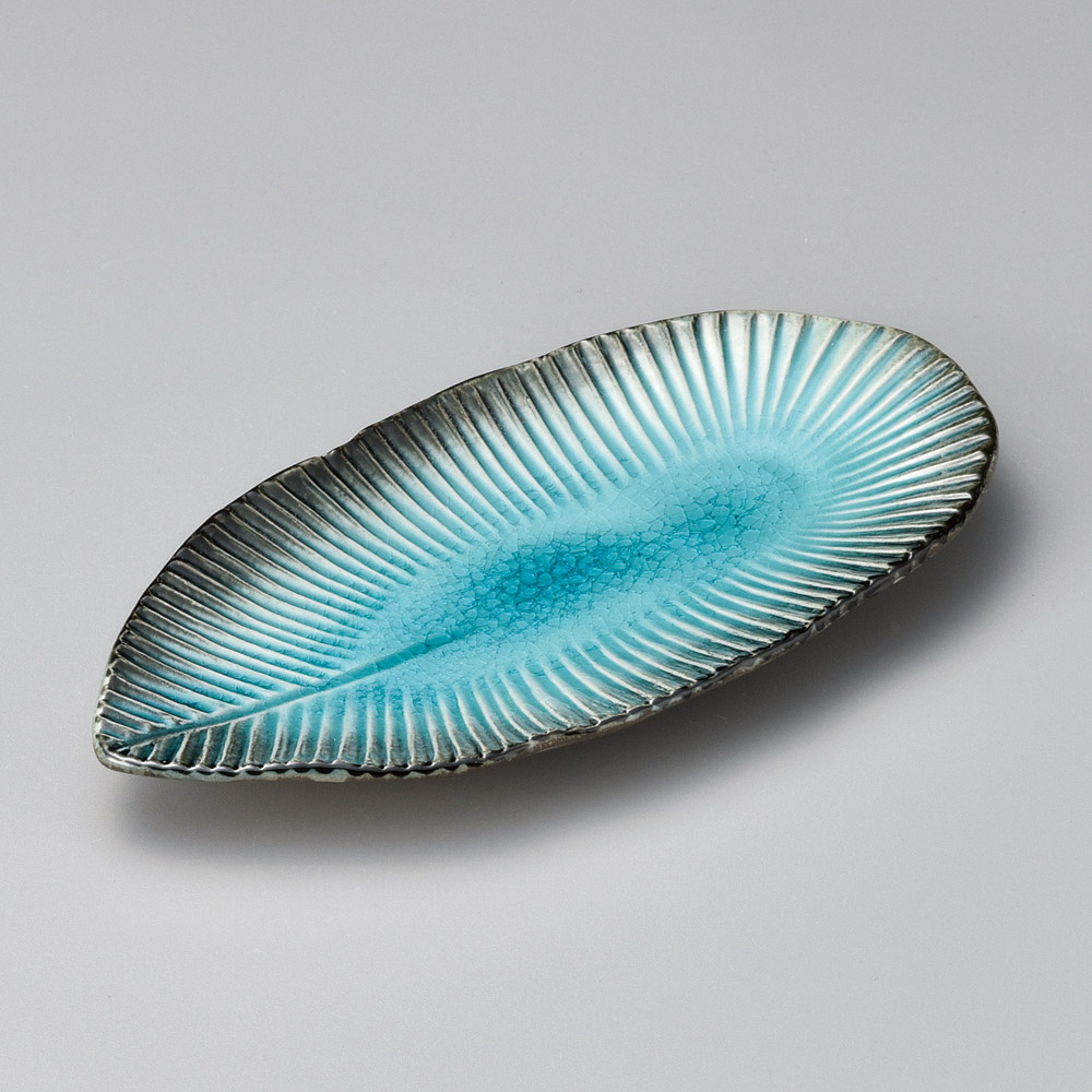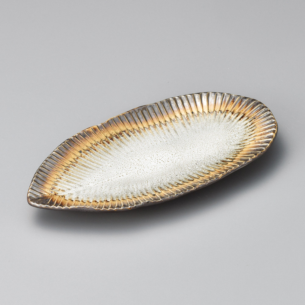乱線白流し葉型長皿 小