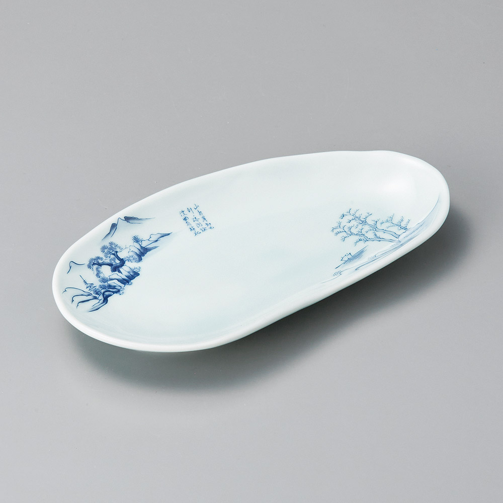 青磁山水楕円焼物皿