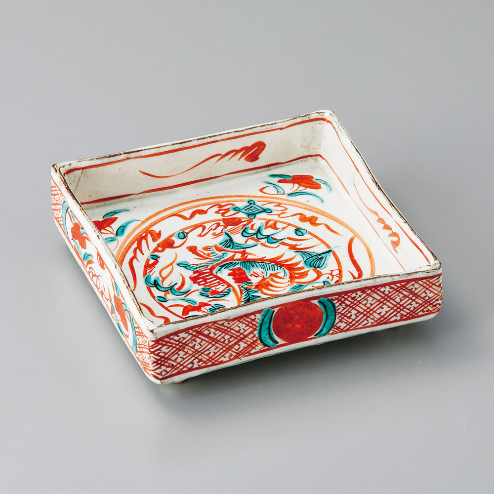 赤彩麒麟紋切立四方鉢