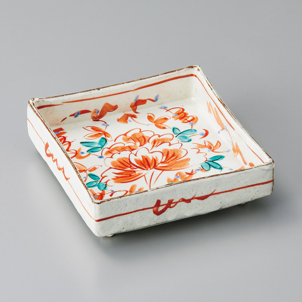 赤彩花紋切立四方鉢