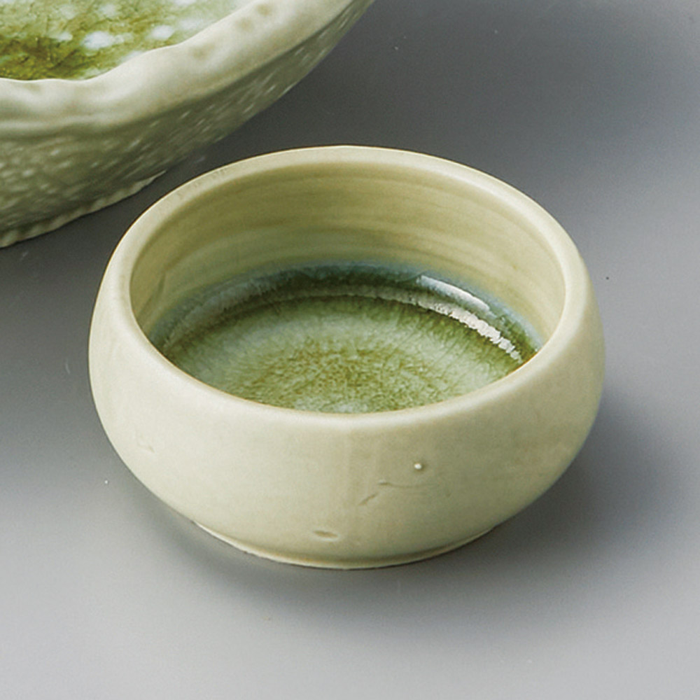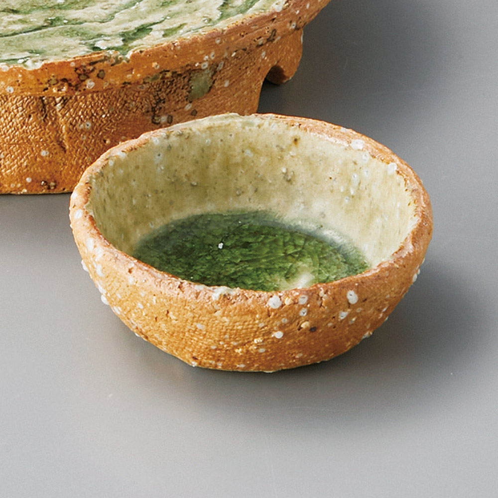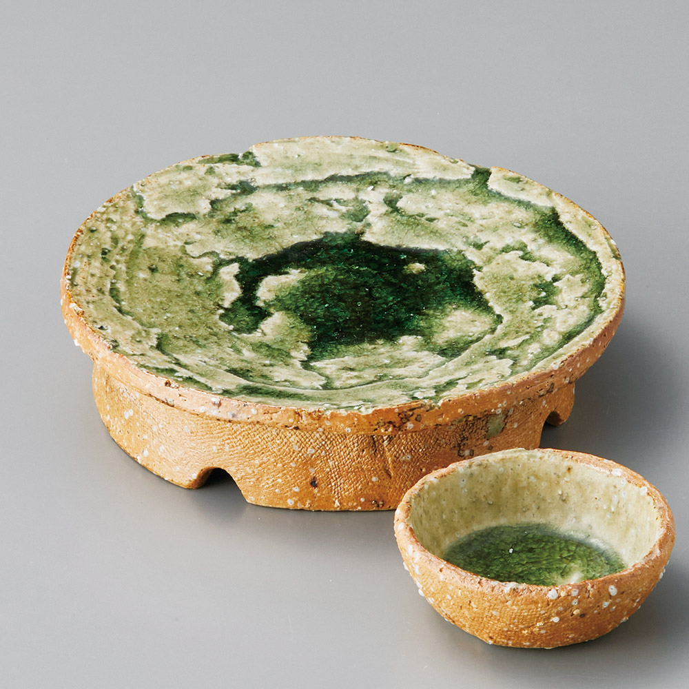 黄釉織部流し反り渦丸珍味