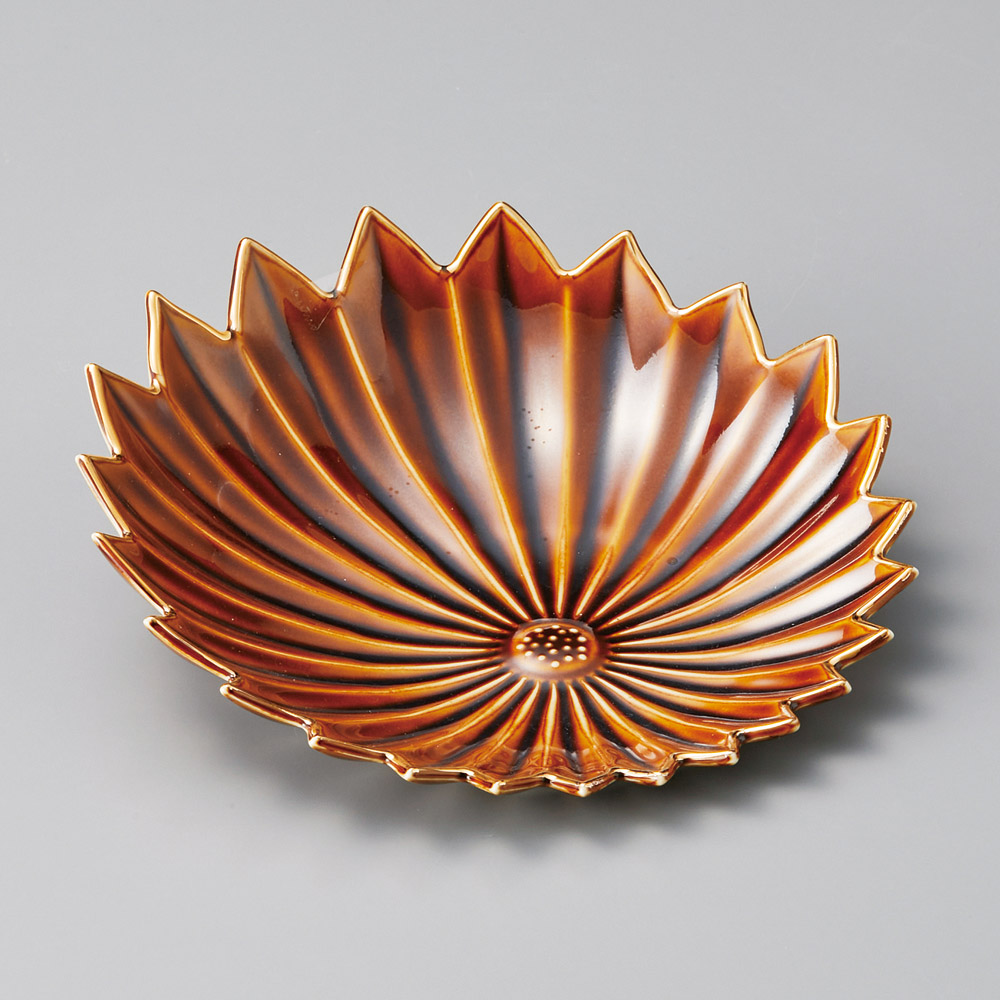 アメ釉渕金上り菊型皿
