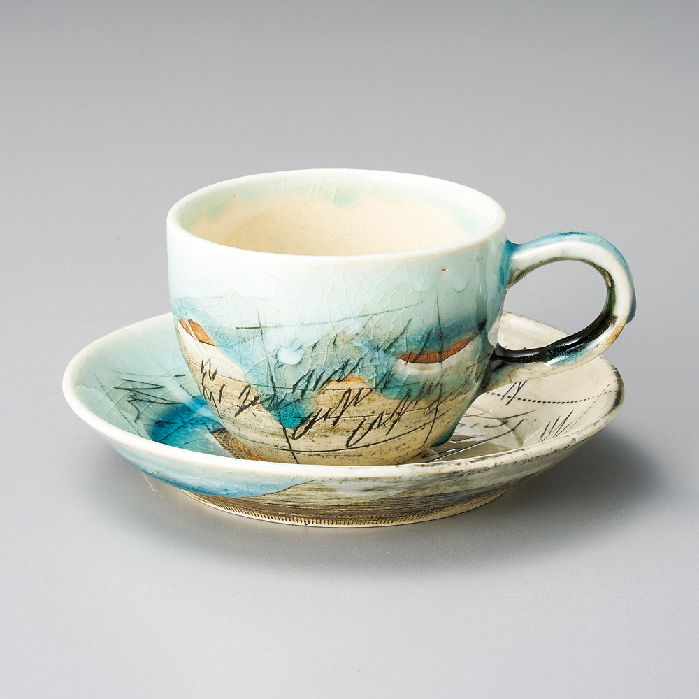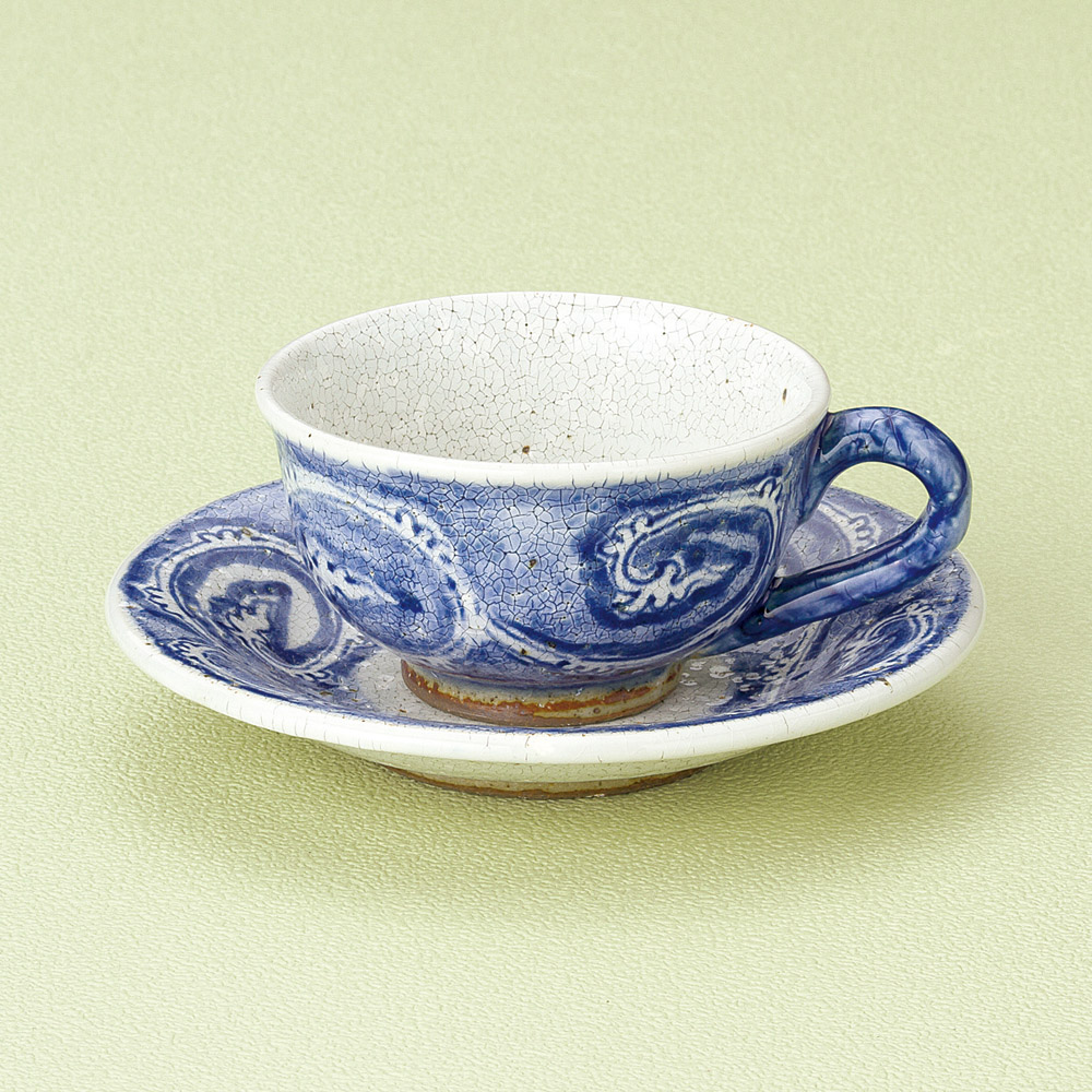 氷雪唐草 青コーヒー碗皿(手描き) (土物)