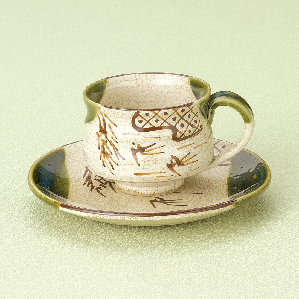 織部つばめコーヒー碗皿 (土物,手造り)