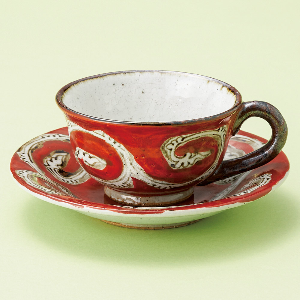 氷雪唐草 赤コーヒー碗皿(手描き)
