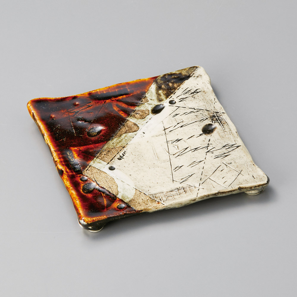 黒窯変角白掛け分け5.0足付角皿(信楽焼)